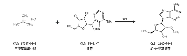 1.通过三甲基氢氧化硫和腺苷合成2''-O-甲基腺苷,收率约77%;