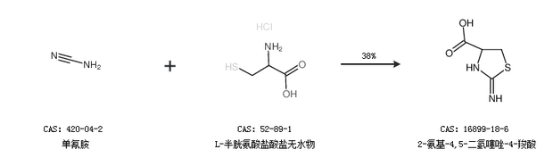 1.通过单氰胺和L-半胱氨酸盐酸盐无水物合成2-氨基-4,5-二氢噻唑-4-羧酸,收率约38%;