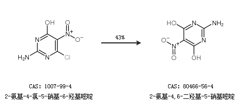 2.通过2-氨基-4-氯-5-硝基-6-羟基嘧啶合成2-氨基-4,6-二羟基-5-硝基嘧啶,收率约43%;