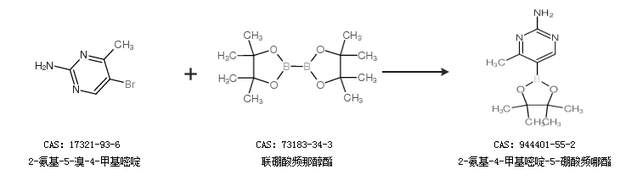 1.通过2-氨基-5-溴-4-甲基嘧啶和联硼酸频那醇酯合成2-氨基-4-甲基嘧啶-5-硼酸频哪酯,收率约74%;