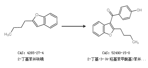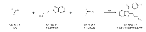 1.通过光气、2-丁基苯并呋喃和1,1-二氯乙烷合成2-丁基-3-(4-羟基苯甲酰基)苯并呋喃,收率约68%;