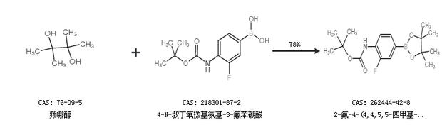 1.通过频哪醇和4-N-叔丁氧羰基氨基-3-氟苯硼酸合成2-氟-4-(4,4,5,5-四甲基-1,3,2-二氧代硼戊烷-2-基)苯基氨基甲酸叔丁酯,收率约78%;