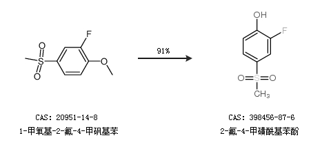 2.通过1-甲氧基-2-氟-4-甲砜基苯合成2-氟-4-甲磺酰基苯酚,收率约91%;