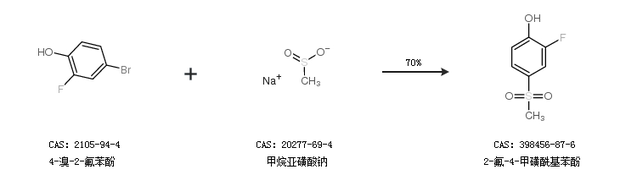 1.通过4-溴-2-氟苯酚和甲烷亚磺酸钠合成2-氟-4-甲磺酰基苯酚,收率约70%;