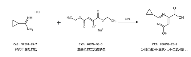 1.通过环丙甲脒盐酸盐和草酰乙酸二乙酯钠盐合成2-环丙基-6-氧代-1,6-二氢-嘧啶-4-羧酸,收率约63%;