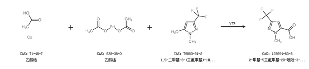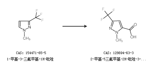 1.通过乙酸钴、乙酸锰和1,5-二甲基-3-(三氟甲基)-1H-吡唑合成2-甲基-5三氟甲基-2H-吡唑-3-羧酸,收率约97%;