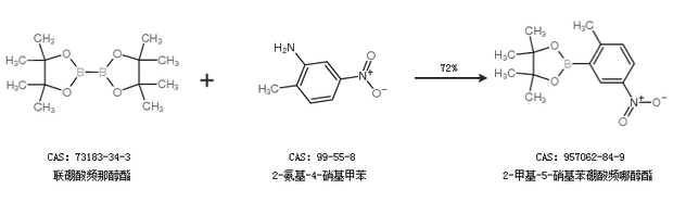 1.通过联硼酸频那醇酯和2-氨基-4-硝基甲苯合成2-甲基-5-硝基苯硼酸频哪醇酯,收率约72%;