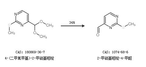 1.通过4-(二甲氧甲基)-2-甲硫基嘧啶合成2-甲硫基嘧啶-4-甲醛,收率约34%;