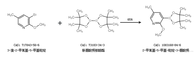 1.通过3-溴-2-甲氧基-5-甲基吡啶和联硼酸频那醇酯合成2-甲氧基-5-甲基-吡啶-3-硼酸频那醇酯,收率约65%;