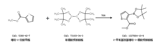 1.通过噻吩-2-羧酸甲酯和联硼酸频那醇酯合成2-甲氧基羰基噻吩-3-硼酸频那醇酯,收率约76%;
