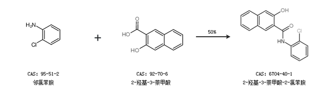 1.通过邻氯苯胺和2-羟基-3-萘甲酸合成2-羟基-3-萘甲酸-2-氯苯胺,收率约50%;