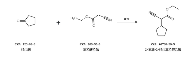 2.通过环戊酮和氰乙酸乙酯合成2-氰基-2-环戊基乙酸乙酯,收率约88%;