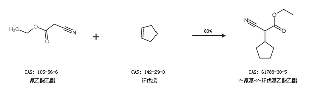 1.通过氰乙酸乙酯和环戊烯合成2-氰基-2-环戊基乙酸乙酯,收率约83%;