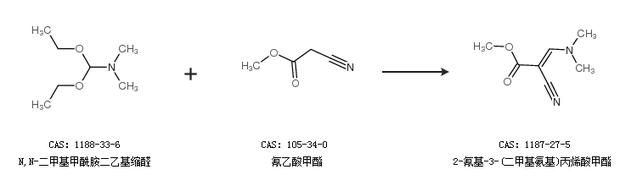 1.通过N,N-二甲基甲酰胺二乙基缩醛和氰乙酸甲酯合成2-氰基-3-(二甲基氨基)丙烯酸甲酯