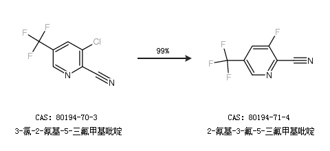 1.通过3-氯-2-氰基-5-三氟甲基吡啶合成2-氰基-3-氟-5-三氟甲基吡啶,收率约99%;