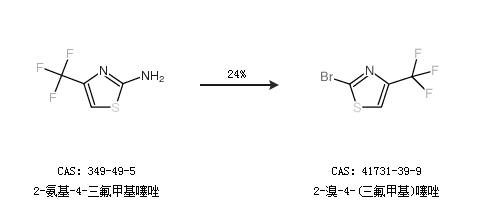 1.通过2-氨基-4-三氟甲基噻唑合成2-溴-4-(三氟甲基)噻唑,收率约24%;