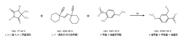 1.通过1,3-二溴-5,5-二甲基海因、1,1′-偶氮双(环己烷甲腈)和3-甲基-4-硝基苯甲醚合成2-溴甲基-4-甲氧基-1-硝基苯,收率约3%;