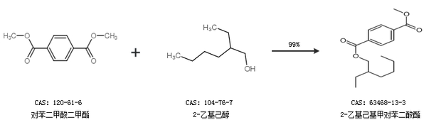 1.通过对苯二甲酸二甲酯和2-乙基己醇合成2-乙基己基甲对苯二酸酯,收率约99%;