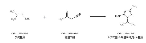 1.通过异丙基肼和氰基丙酮合成2-异丙基-5-甲基2H-吡唑-3-基胺