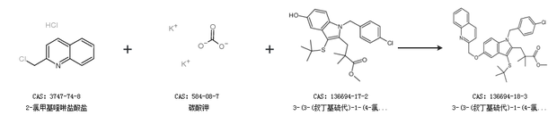 2.通过2-氯甲基喹啉盐酸盐、碳酸钾和3-(3-(叔丁基硫代)-1-(4-氯苄基)-5-羟基-1H-吲哚-2-基)-2,2-二甲基丙酸甲酯合成3-(3-(叔丁基硫代)-1-(4-氯苄基)-5-(喹啉-2-基甲氧基)-1H-吲哚-2-基)-2,2-二甲基丙酸甲酯