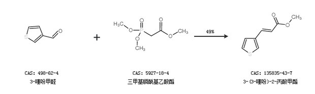 1.通过3-噻吩甲醛和三甲基膦酰基乙酸酯合成3-(3-噻吩)-2-丙酸甲酯,收率约49%;