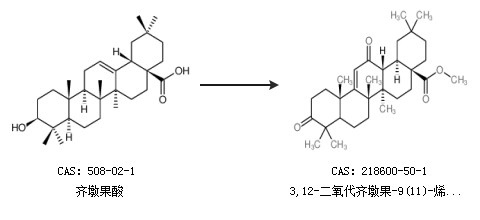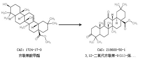 英文别名 Olean-9(11)-en-28-oic acid,3,12-dioxo-,methyl ester;2,2,6a,6b,9,9,12a-Heptamethyl-10,14-dioxo-1,3,4,5,6,6a,6b,7,8,8a,9,10,11,12,12a,14,14a,14b-octadecahydro-2H-picene-4a-carboxylic acid methyl ester;(4aS,6aR,6bS,12aS,14aR,14bR)-methyl-2,2,6a,6b,9,9,12a-heptamethyl-10,14-dioxo-1,2,3,4,4a,5,6,6a,6b,7,8,8a,9,10,11,12,12a,14,14a,14b-icosahydropicene-4a-carboxylate;Methyl 3,12-dioxoolean-9(11)-en-28-oate;