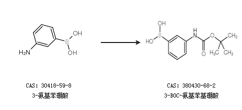1.通过3-氨基苯硼酸合成3-BOC-氨基苯基硼酸,收率约43%;