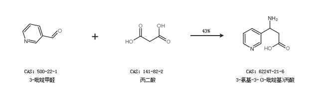 2.通过3-吡啶甲醛和丙二酸合成3-氨基-3-(3-吡啶基)丙酸,收率约43%;