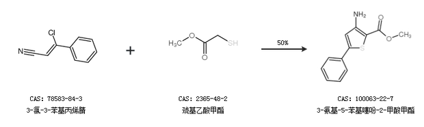 1.通过3-氯-3-苯基丙烯腈和巯基乙酸甲酯合成3-氨基-5-苯基噻吩-2-甲酸甲酯,收率约50%;
