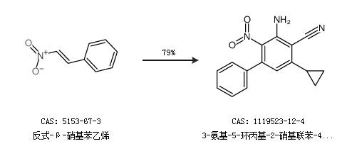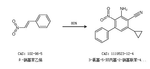 2.通过β-硝基苯乙烯合成3-氨基-5-环丙基-2-硝基联苯-4-甲腈,收率约80%;