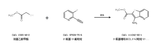 2.通过巯基乙酸甲酯和2-氰基-3-氟吡啶合成3-氨基噻吩并[3,2-b]吡啶-2-甲酸甲酯,收率约95%;