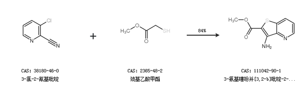 1.通过3-氯-2-氰基吡啶和巯基乙酸甲酯合成3-氨基噻吩并[3,2-b]吡啶-2-甲酸甲酯,收率约84%;