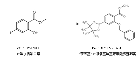2.通过4-碘水杨酸甲酯合成3-苄氧基-4-甲氧基羰基苯硼酸频那醇酯