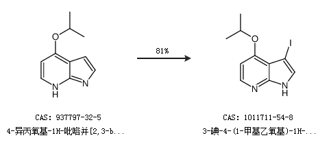 1.通过4-异丙氧基-1H-吡咯并[2,3-b]吡啶合成3-碘-4-(1-甲基乙氧基)-1H-吡咯并[2,3-B]吡啶,收率约81%;