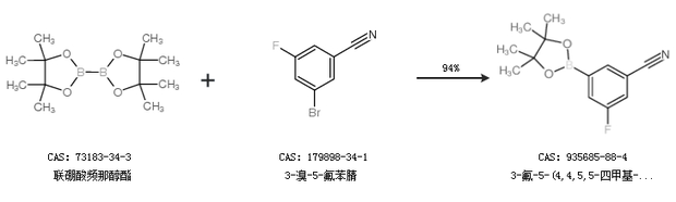1.通过联硼酸频那醇酯和3-溴-5-氟苯腈合成3-氟-5-(4,4,5,5-四甲基-1,3,2-二噁硼烷-2-基)苯甲腈,收率约94%;