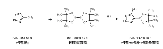 2.通过3-甲基吡唑和联硼酸频那醇酯合成3-甲基-1H-吡唑-4-硼酸频哪醇酯,收率约38%;