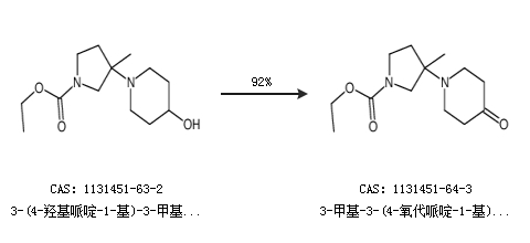 1.通过3-(4-羟基哌啶-1-基)-3-甲基吡咯烷-1-羧酸乙酯合成3-甲基-3-(4-氧代哌啶-1-基)吡咯烷-1-羧酸乙酯,收率约92%;