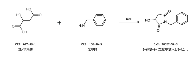 2.通过DL-苹果酸和苯甲胺合成3-羟基-1-(苯基甲基)-2,5-吡咯烷二酮,收率约69%;