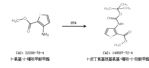 1.通过3-氨基-2-噻吩甲酸甲酯合成3-叔丁氧基羰基氨基-噻吩-2-羧酸甲酯,收率约85%;