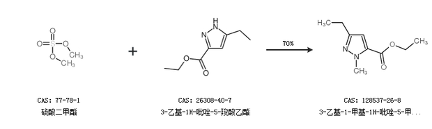 1.通过硫酸二甲酯和3-乙基-1H-吡唑-5-羧酸乙酯合成3-乙基-1-甲基-1H-吡唑-5-甲酸乙酯,收率约70%;
