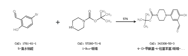 1.通过5-溴水杨醛和1-Boc-哌嗪合成4-(3-甲酰基-4-羟基苯基)哌嗪-1-羧酸叔丁酯,收率约57%;