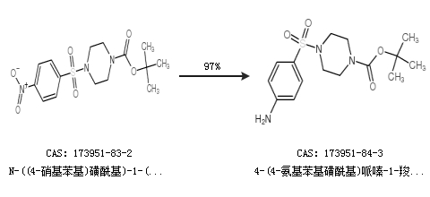 1.通过N-((4-硝基苯基)磺酰基)-1-(叔丁基氧基羰基)哌嗪合成4-(4-氨基苯基磺酰基)哌嗪-1-羧酸叔丁酯,收率约97%;