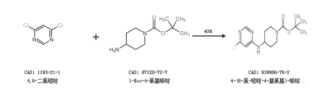 1.通过4,6-二氯嘧啶和1-Boc-4-氨基哌啶合成4-(6-氯-嘧啶-4-基氨基)-哌啶-1-羧酸叔丁酯,收率约40%;