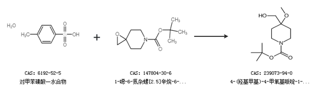 1.通过对甲苯磺酸一水合物和1-噁-6-氮杂螺[2.5]辛烷-6-羧酸-1,1-二甲基乙酯合成4-(羟基甲基)-4-甲氧基哌啶-1-羧酸叔丁酯
