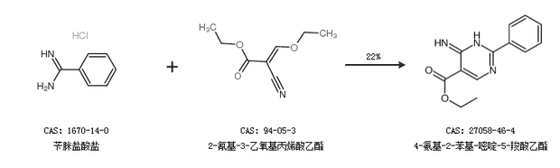 1.通过苄脒盐酸盐和2-氰基-3-乙氧基丙烯酸乙酯合成4-氨基-2-苯基-嘧啶-5-羧酸乙酯,收率约22%;