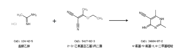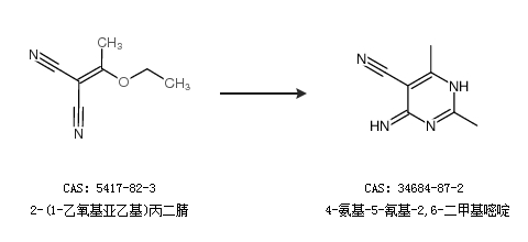 2.通过2-(1-乙氧基亚乙基)丙二腈合成4-氨基-5-氰基-2,6-二甲基嘧啶