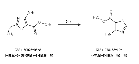 2.通过4-氨基-2-(甲巯基)-5-噻吩甲酸合成4-氨基-5-噻唑甲酸甲酯,收率约34%;