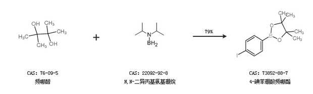 1.通过频哪醇和N,N-二异丙基氨基硼烷合成4-碘苯硼酸频哪酯,收率约79%;