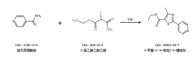 1.通过硫代异烟酰胺和2-氯乙酰乙酸乙酯合成4-甲基-2-(4-吡啶)-5-噻唑羧酸乙酯,收率约73%;