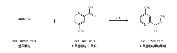 1.通过重氮甲烷和4-甲基吡啶-2-甲酸合成4-甲基吡啶甲酸甲酯,收率约31%;